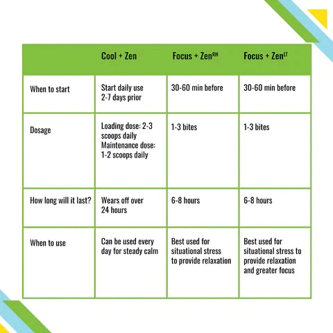 - Can be used in combination with LT+ chews and / or Cool + Zen