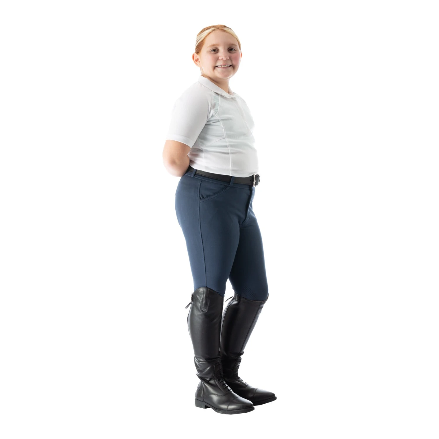 Equinavia Greta Kids Silicone Knee Patch Breeches are an excellent option both in and out of the show ring! Mid-weight, ultra soft fabric with silicone knee patch grip keeps you secure in the saddle. Micromesh lower legs provides a streamlined look and feel under your boot, while keeping you cool. Great stretch and overall comfort in this breech. The Greta breeches are the ultimate choice combining function, comfort and style.