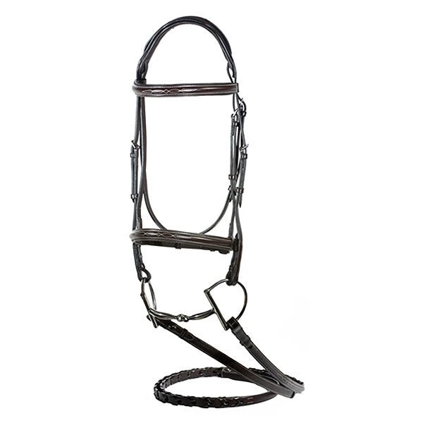 The Elena is the best bridle available at this price! Made from premium leather with stainless steel hardware, The Elena is part of the Argento Collection with a padded inlaid crown. This bridle is raised and features fancy stitching on the brow band and cavesson. You are sure to make a statement in this bridle whether at home or in the show ring. Sold complete with matching raised and fancy stitched laced reins.