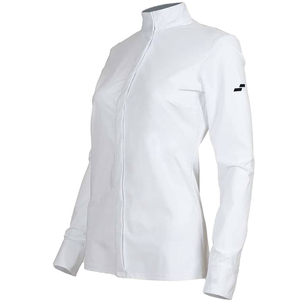 Our long sleeve white show shirt is perfect for that tailored look in and out of the ring. Using the highest grade of performance fabrics, we have created a design that fits and flatters your body, has tons of stretch, and keeps you cool and comfortable. The back panels are made to provide extra ventilation, offering the best in moisture and heat management. The subtle decoration on the left sleeve completes the sophisticated look.